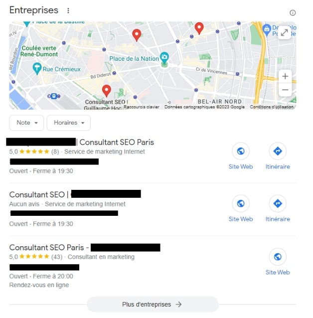Vous l'avez certainement déjà remarquée : lorsque vous effectuez une recherche locale, Google affiche souvent un encart avec une carte et une liste de trois entreprises correspondantes. C'est ce que l'on appelle le « local pack » ou « pack local ». Être bien positionné dans ce pack est très important, car cela vous offre une visibilité maximale auprès des clients locaux au moment précis où ils ont besoin de vos services ou produits.