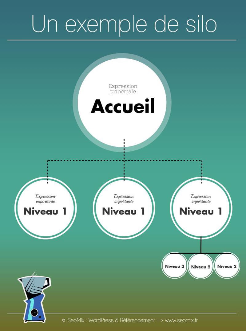Un silo est une section de votre site dédié à une thématique, en l’occurrence une expression principale. Chaque silo va ainsi contenir une page mère qui ciblera ce terme, puis chaque sous-page va venir cibler une expression secondaire et ainsi renforcer l'ensemble de la section.
