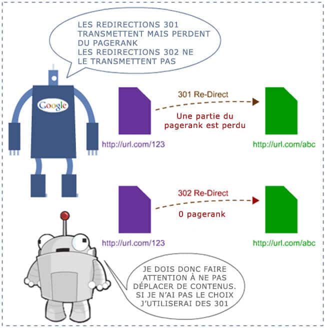 L'outil permet également de détecter les redirections 301 (permanentes) et les redirections 302 (temporaires). Pour rappel, voilà l'impact qu'elles ont sur le transfert de popularité d'une page :